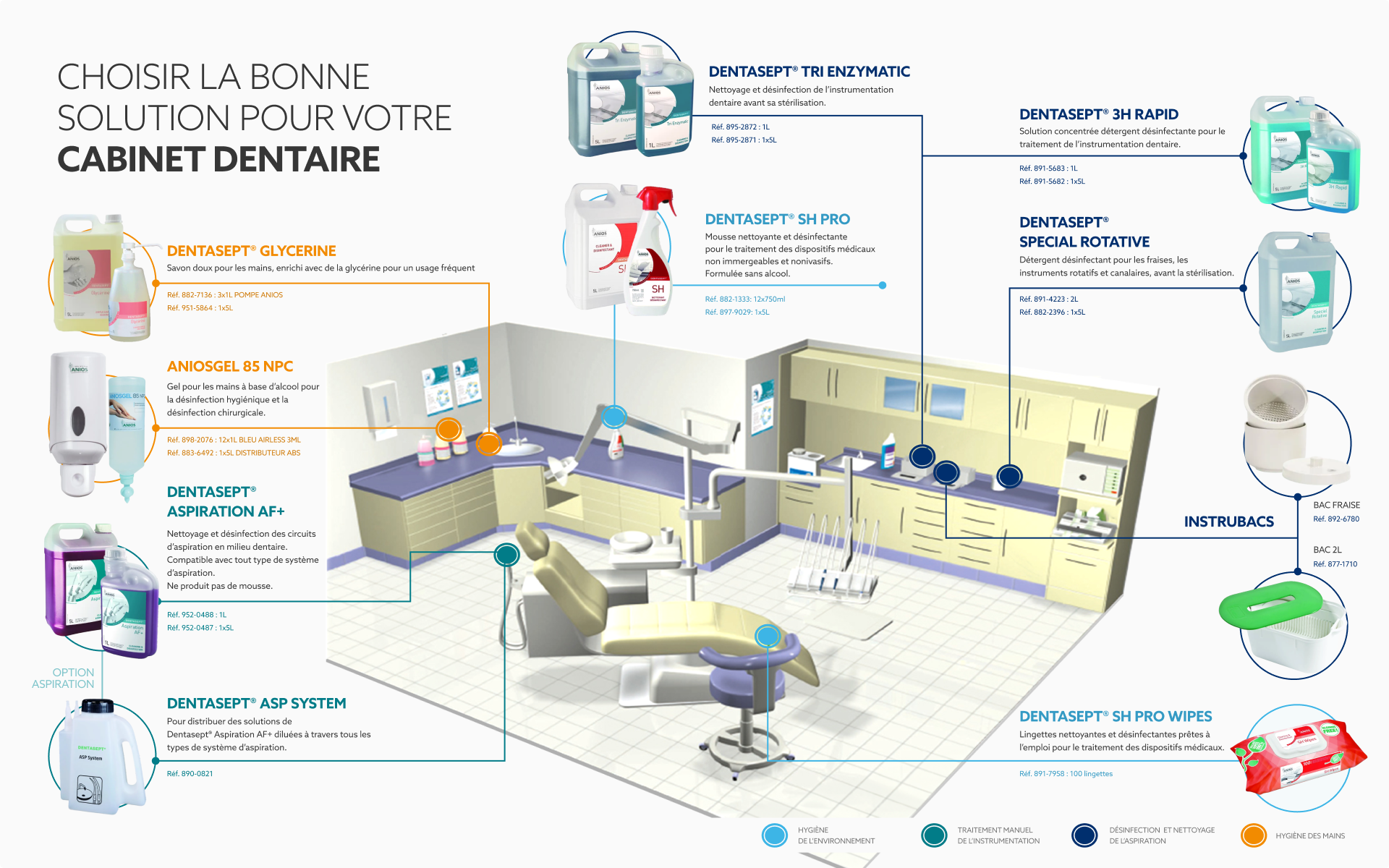 La lutte contre les micro-organismes impose une maîtrise totale de tous les paramètres de la désinfection, de l’antisepsie et de la détergence. Notre objectif est de proposer aux cabinets dentaires une offre globale, adaptée et de qualité pour la désinfection de votre environnement de travail.